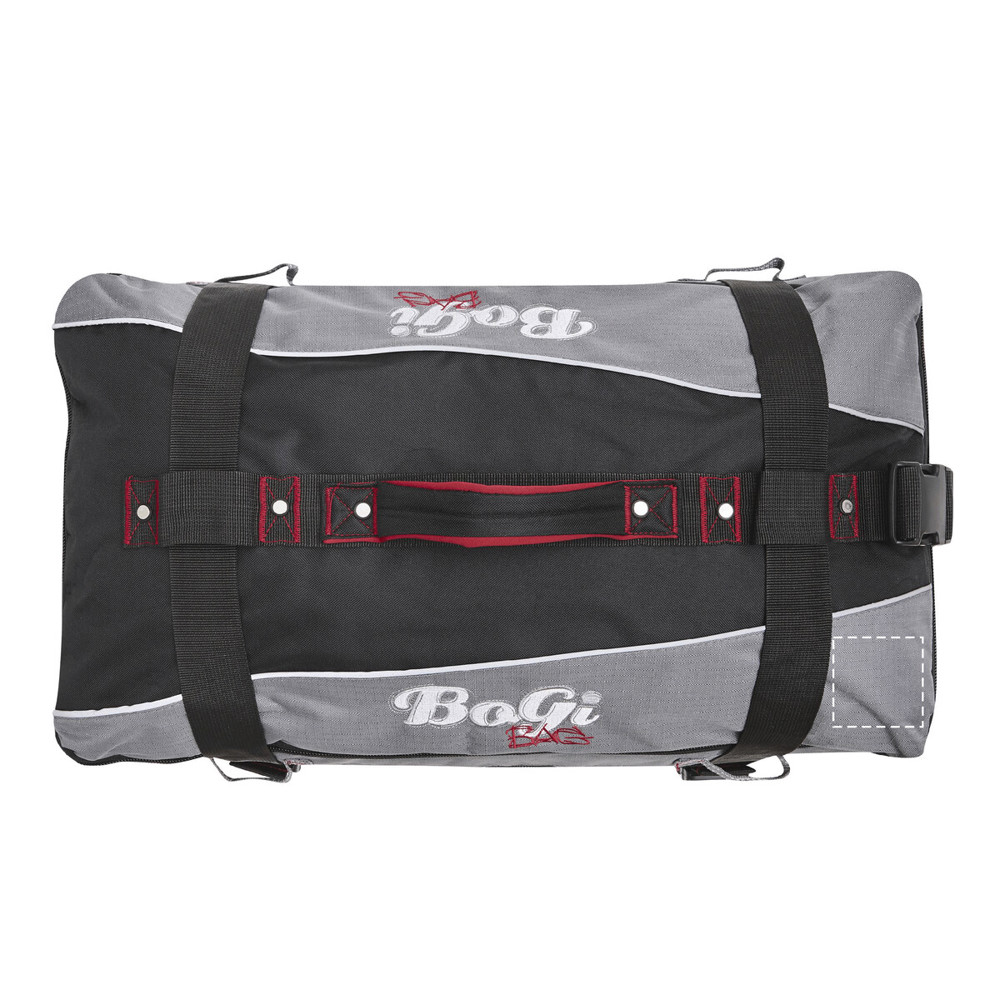 Trolley-Reisetasche BoGi L: getrennte Packebenen mit Reißverschluss, Hauptfach mit 2 Trennwänden, aufgesetzte Netztasche innen, 2 Reißverschluss-Fächer innen, 2 gepolsterte Tragegriffe, versenkbares Trolleygestell, 2 Kompressionsgurte mit Schnappverschluss, Adressfach auf der Rückseite, Leichtlauf-Skaterrollen mit Kantenschutz, 2 Gleitschienen für Treppentransport und Bodenfüße, beigefügtes Zahlenkombinationsschloss