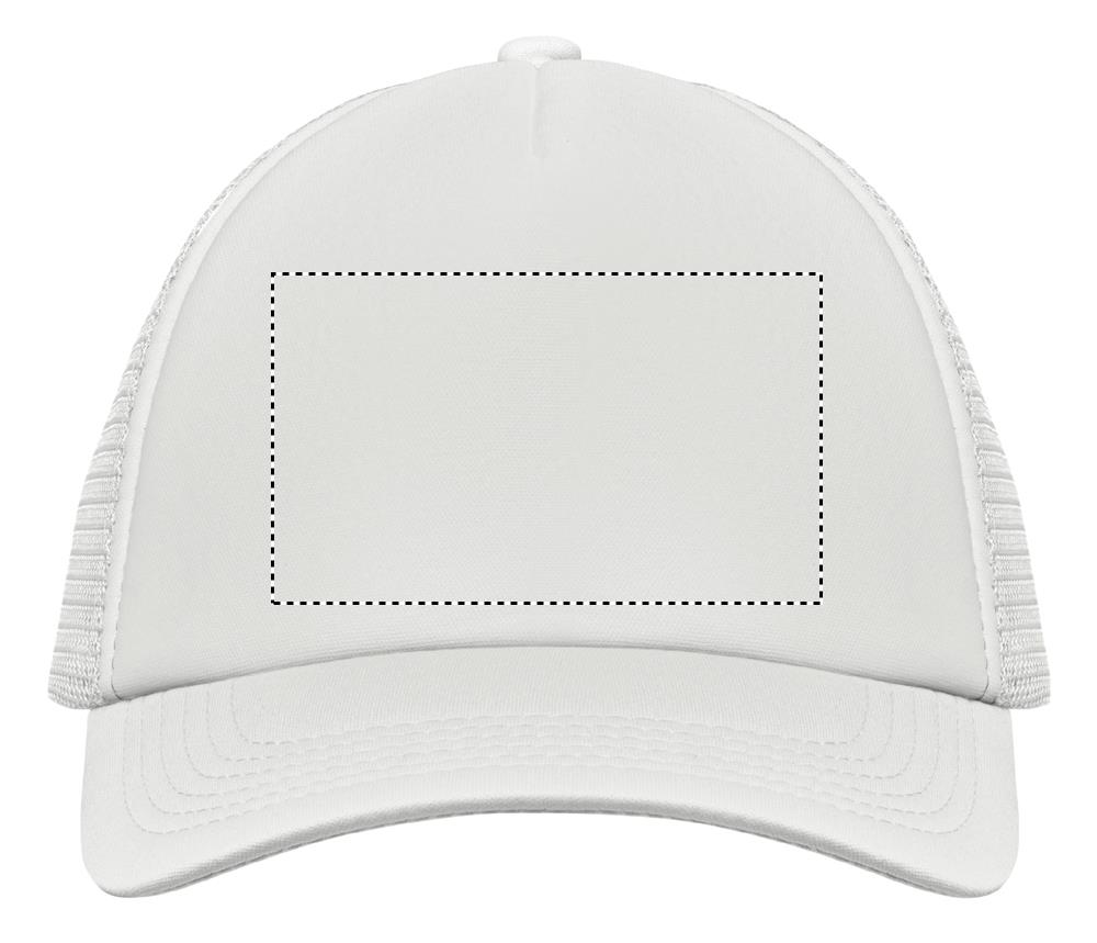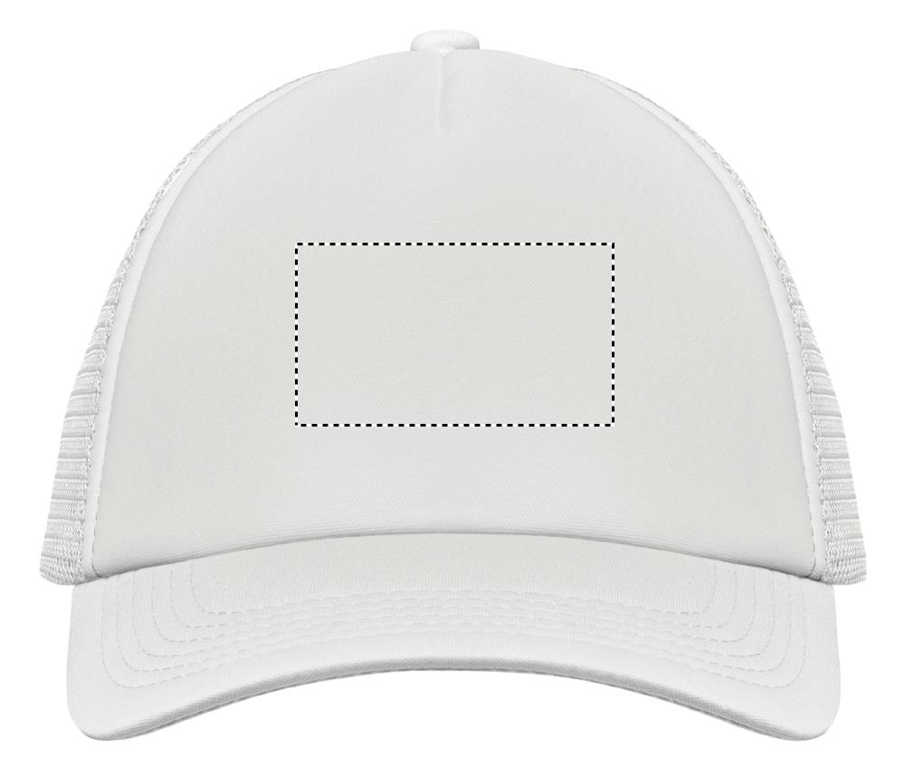 Trucker Kappe. 5 Panele. 140-150 gr/m2 Polyester. Verstellbarer Kunststoffverschluss. Weißes Frontpanel, farbiger Kappenschirm aus Polyester Jersey mit Schaum-Verstärkung. Weitere Panele aus Mesh. Größe 7 1/4.