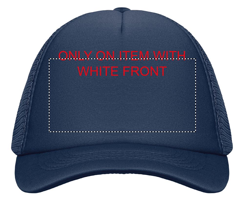 Trucker Kappe. 5 Panele. 140-150 gr/m2 Polyester. Verstellbarer Kunststoffverschluss. Weißes Frontpanel, farbiger Kappenschirm aus Polyester Jersey mit Schaum-Verstärkung. Weitere Panele aus Mesh. Größe 7 1/4.