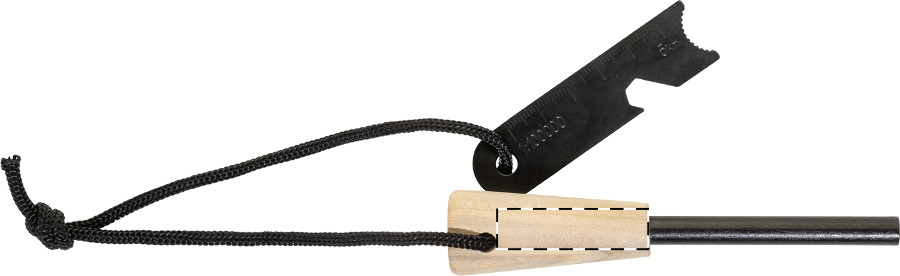 Überlebens-Feuerstarter-Werkzeug mit Holzgriff und multifunktionalem Edelstahlschaber, ausgestattet mit Lineal, Flaschenöffner und Inbusschlüssel.