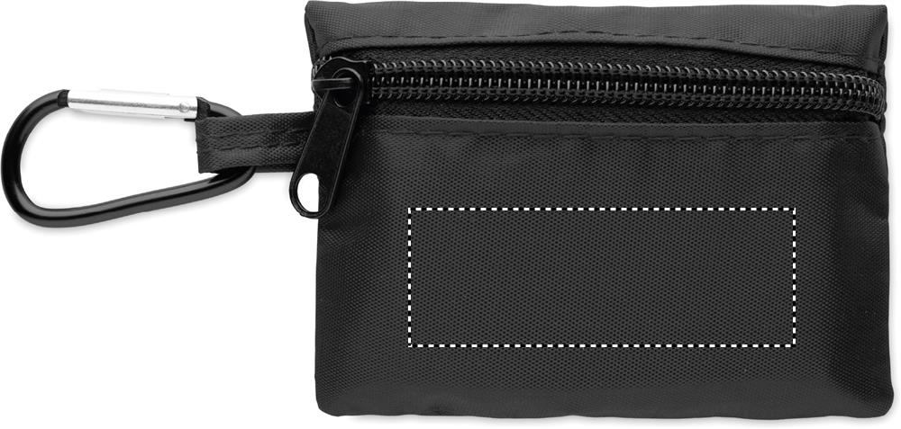 Erste-Hilfe-Set im RPET-Etui mit Aluminiumkarabiner. Inhalt. 4 Alkoholtupfer, 3 Pflaster, 2 Verbände, 2 Mullbinden, 1 Klebeband und 1 Schere. Nicht außerhalb der EU erhältlich.