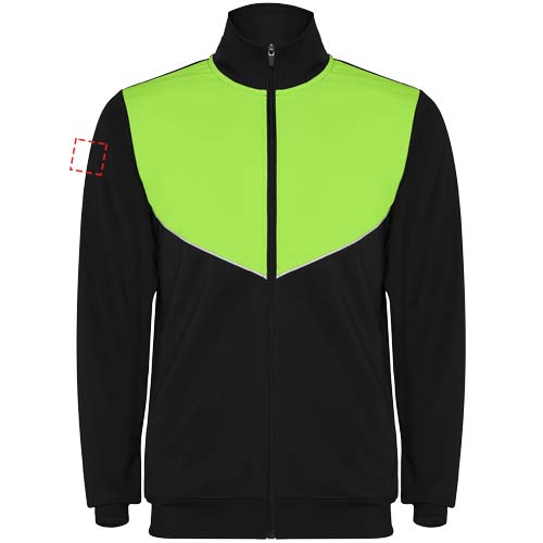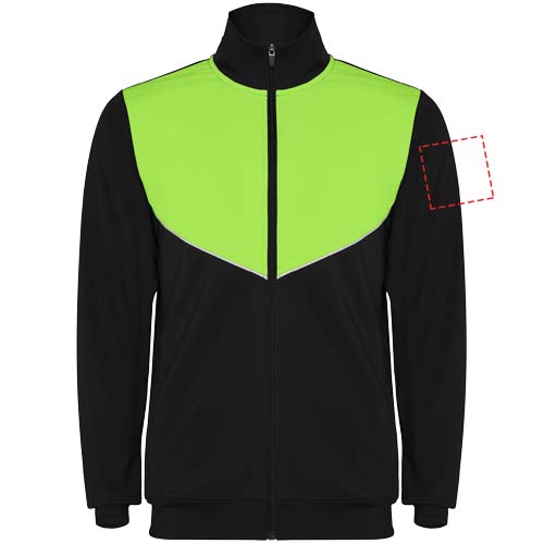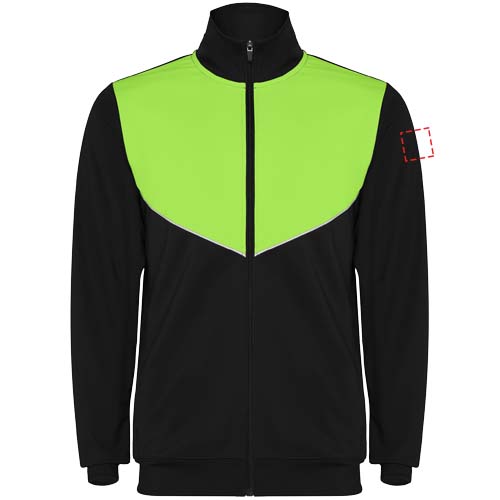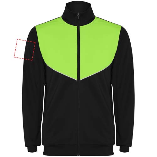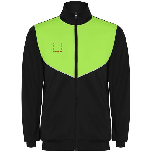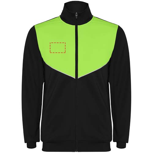 Trainingsanzug aus leichtem und elastischem Stoff. Jacke mit farblich abgesetzten Nähten im Brustbereich. Hoher Kragen mit Kontrastnähten. Zentraler Frontreißverschluss. Seitentaschen. 2x2-Rippenbündchen an Ärmeln und Bund. Hose mit elastischem Bund und Kordelzug. Seitliche Kontrasteinsätze mit Steppnaht. Beinsaum mit Reißverschluss.