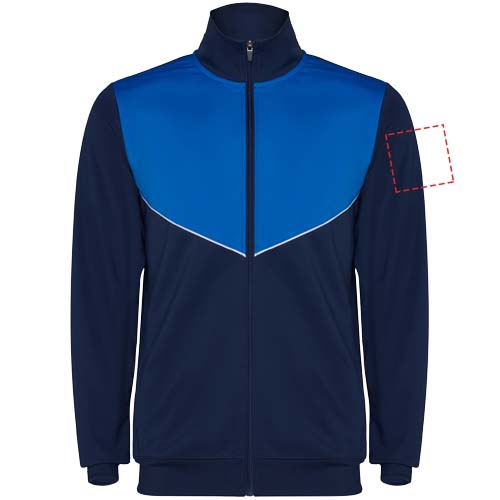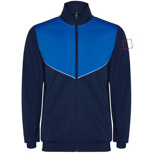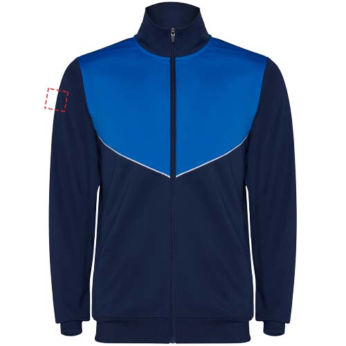 Trainingsanzug aus leichtem und elastischem Stoff. Jacke mit farblich abgesetzten Nähten im Brustbereich. Hoher Kragen mit Kontrastnähten. Zentraler Frontreißverschluss. Seitentaschen. 2x2-Rippenbündchen an Ärmeln und Bund. Hose mit elastischem Bund und Kordelzug. Seitliche Kontrasteinsätze mit Steppnaht. Beinsaum mit Reißverschluss.