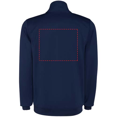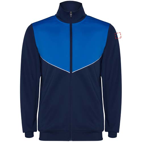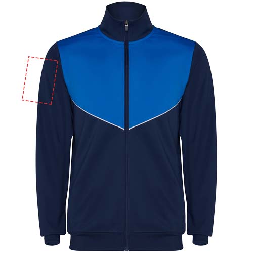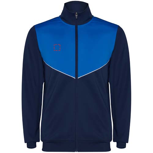 Trainingsanzug aus leichtem und elastischem Stoff. Jacke mit farblich abgesetzten Nähten im Brustbereich. Hoher Kragen mit Kontrastnähten. Zentraler Frontreißverschluss. Seitentaschen. 2x2-Rippenbündchen an Ärmeln und Bund. Hose mit elastischem Bund und Kordelzug. Seitliche Kontrasteinsätze mit Steppnaht. Beinsaum mit Reißverschluss.