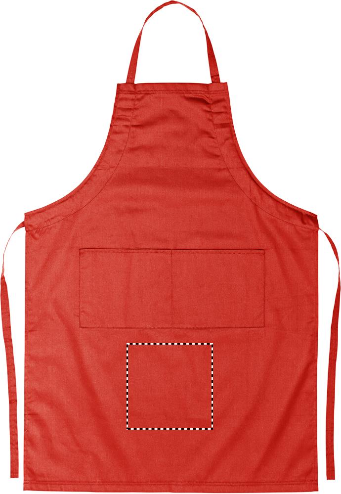Küchenschürze mit verstellbarem Nackenband und 2 Fronttaschen. 10% Baumwolle / 90% Polyester, 190 g/m².