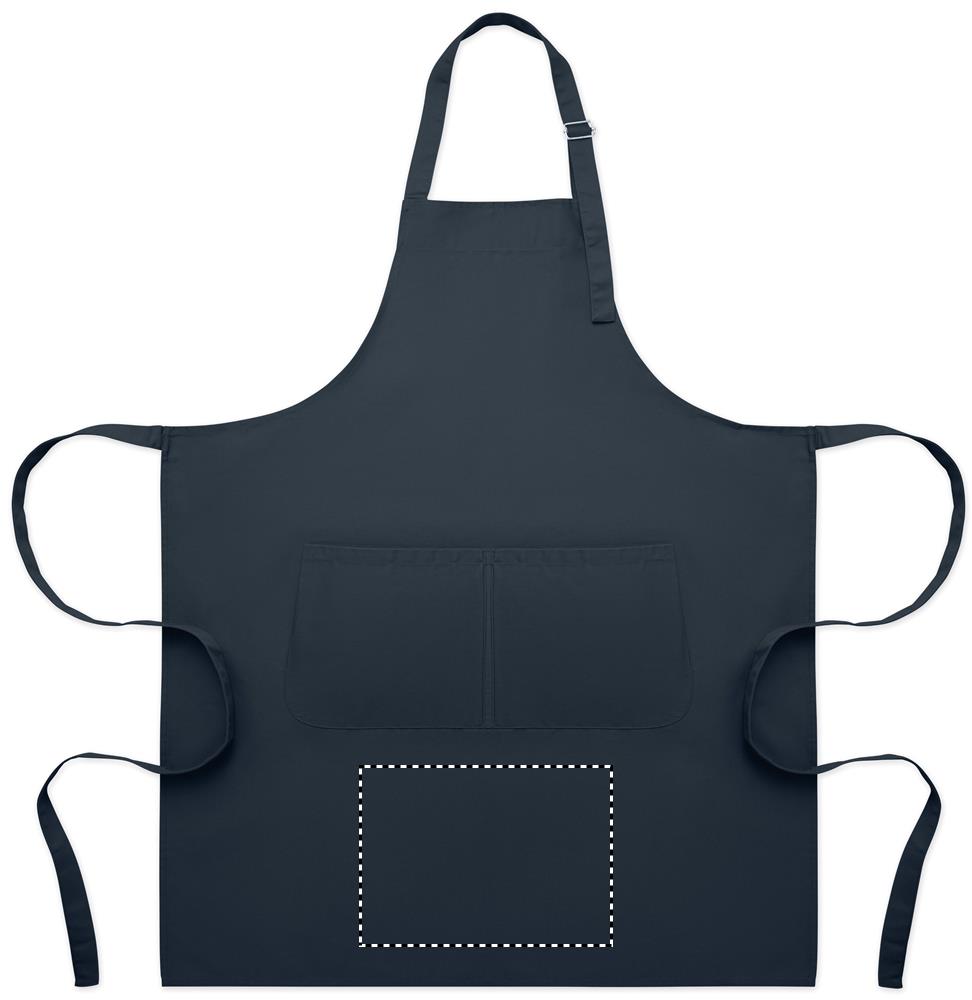 Lange, verstellbare Küchenschürze aus 240 g/m² Polycotton (35% Baumwolle, 65% Polyester) mit zwei Fronttaschen und verstellbarem Gurt mit Metallschnalle.