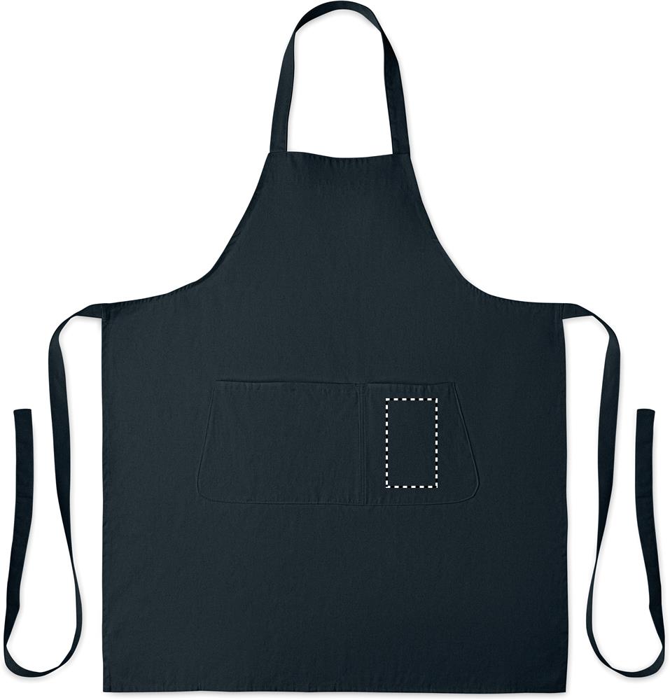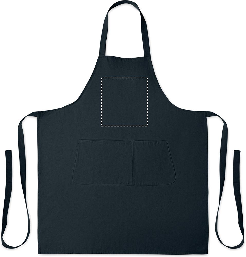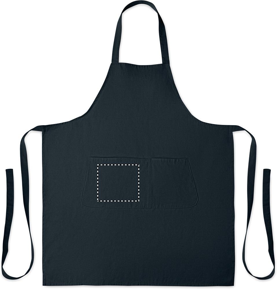 Verstellbare Küchenschürze mit 1 großen Fronttasche mit 2 Fächern. 240 g/m² Organic Cotton. Per Knopf verstellbares Nackenband.