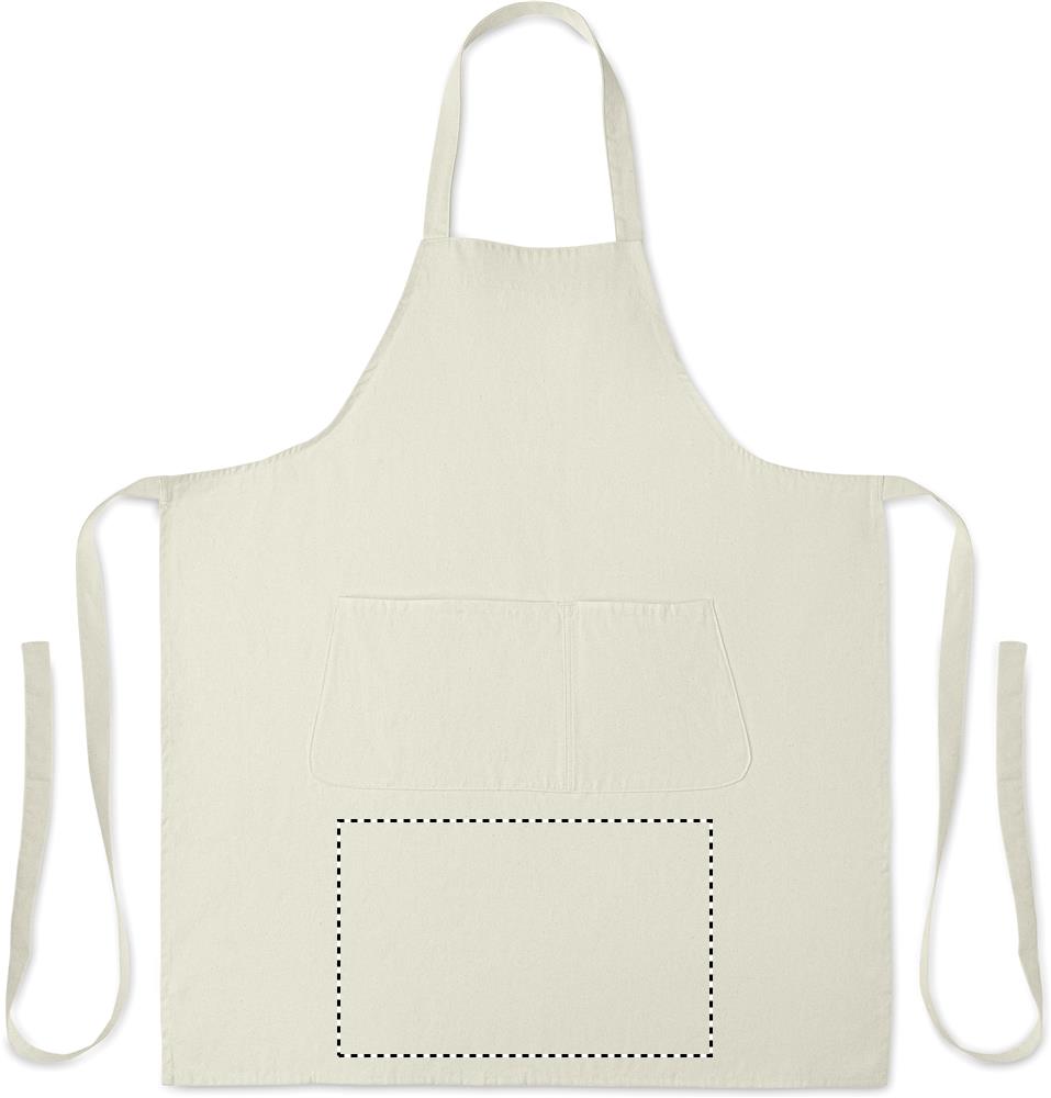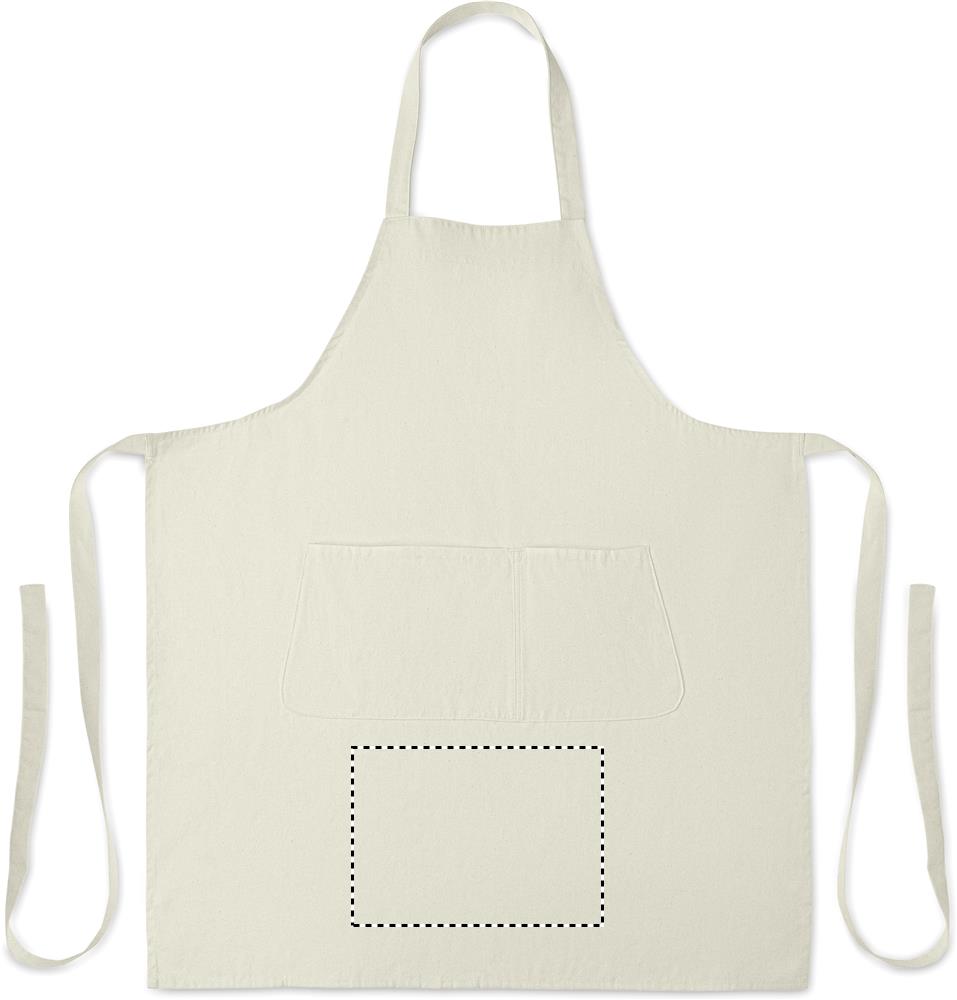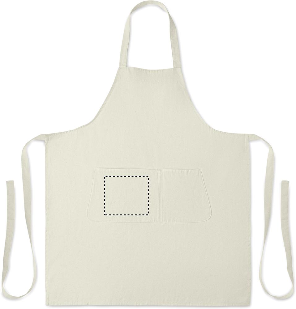 Verstellbare Küchenschürze mit 1 großen Fronttasche mit 2 Fächern. 240 g/m² Organic Cotton. Per Knopf verstellbares Nackenband.