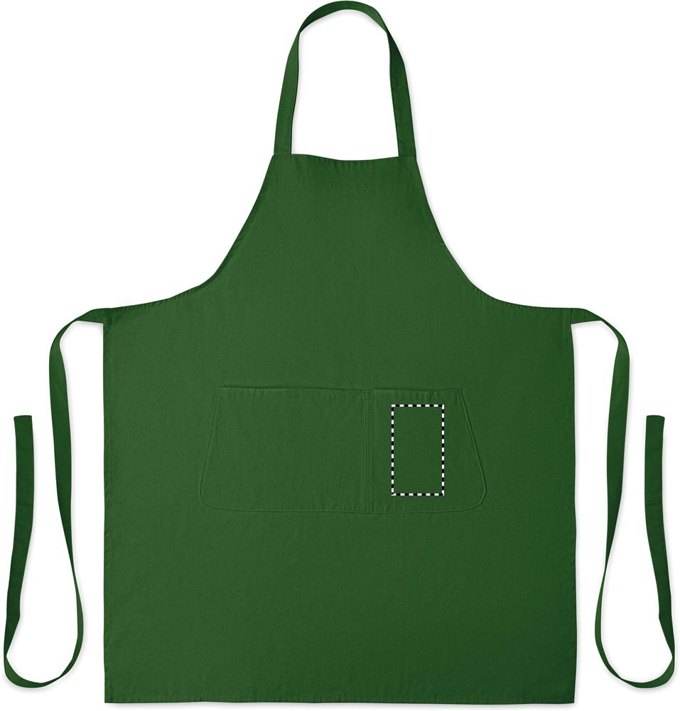 Verstellbare Küchenschürze mit 1 großen Fronttasche mit 2 Fächern. 240 g/m² Organic Cotton. Per Knopf verstellbares Nackenband.