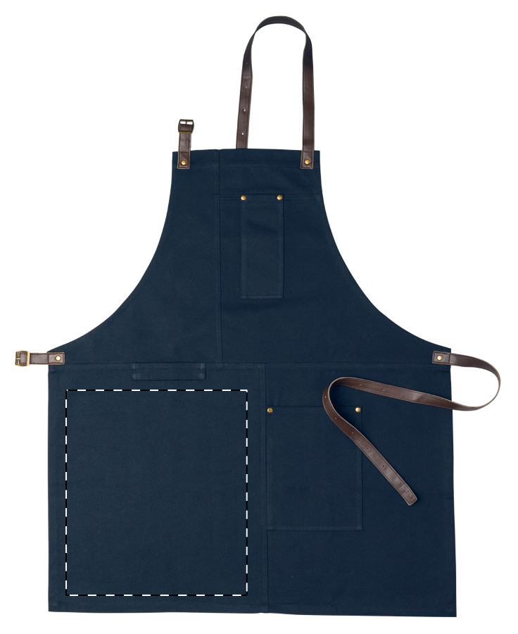 Schürze aus Baumwolle (340 g/m²) mit Brusttasche und einstellbaren Kunstleder-riemen.