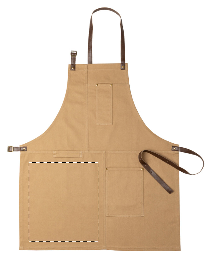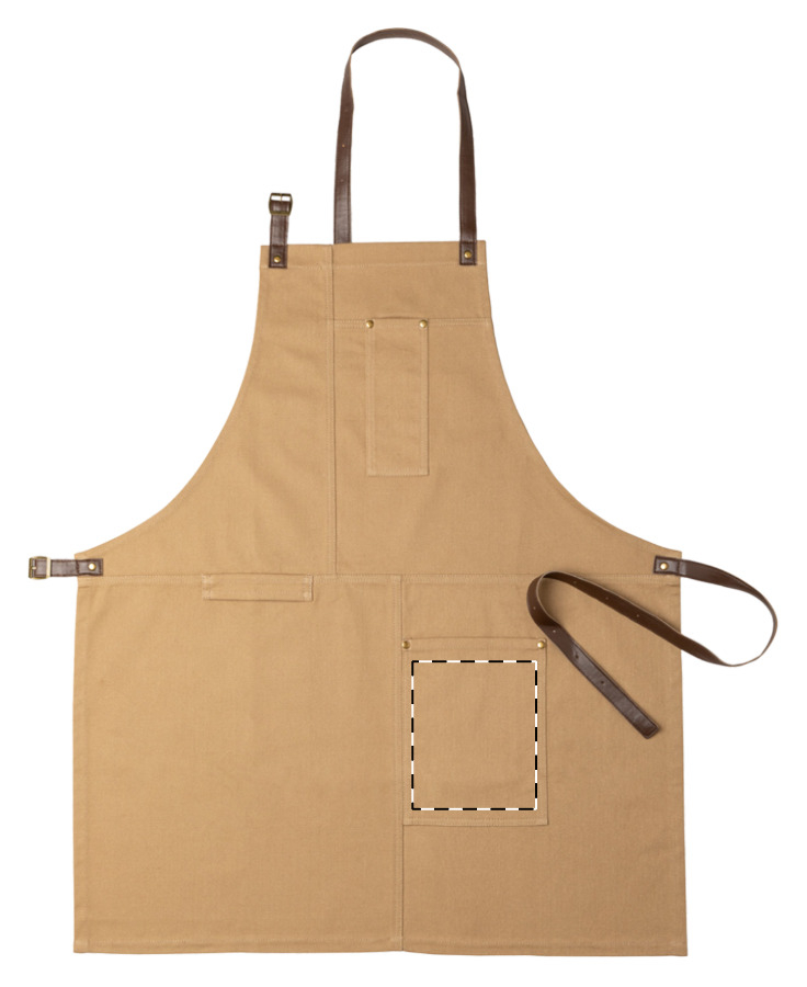 Schürze aus Baumwolle (340 g/m²) mit Brusttasche und einstellbaren Kunstlederriemen.