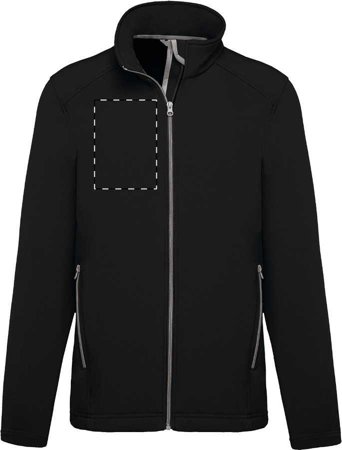 Doppellagige Softshelljacke mit Reißverschluss und seitlichen Reißverschlusstaschen. Mit kontrastfarbenen Reißverschlüssen. Wasserabweisendes Material. Außen: 95 % Polyester und 5 % Elasthan. Innen: 100 % Polyester-Micro-Polarfleece. 300 g/m². Marke: Kariban.