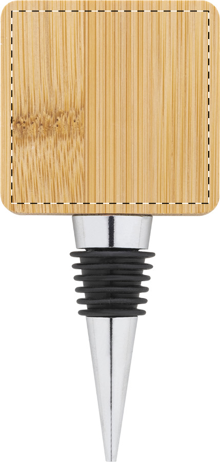 Weinverschluss aus Metall mit quadratischem Flaschenöffner aus Bambus.