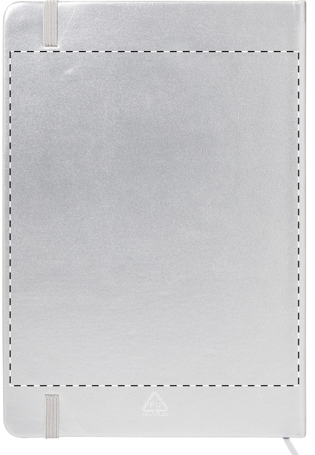 Notizbuch mit metallisch glänzendem Einband aus recyceltem PU-Leder, 100 Blätter (liniert) aus Recyclingpapier. Inklusive farblich abgestimmtem Lesezeichen und Gummiband. Format A5.