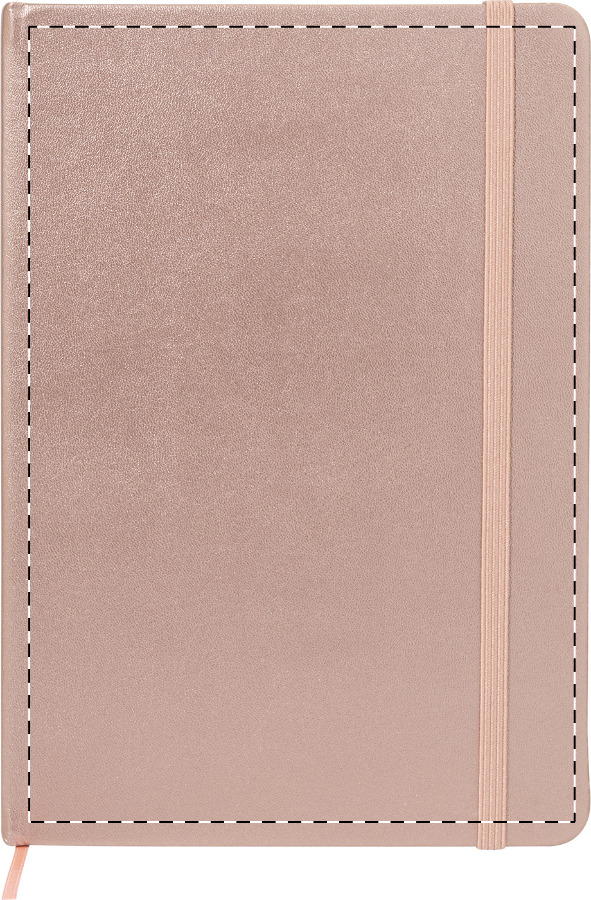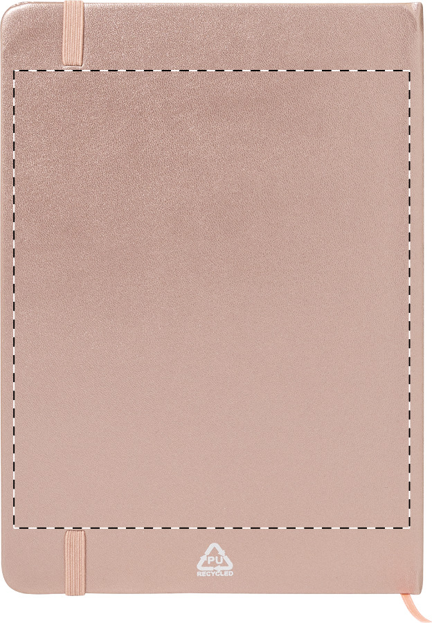 Notizbuch mit metallisch glänzendem Einband aus recyceltem PU-Leder, 100 Blätter (liniert) aus Recyclingpapier. Inklusive farblich abgestimmtem Lesezeichen und Gummiband. Format A5.