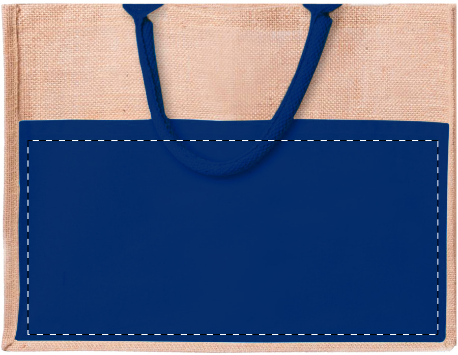 Laminierte Strandtasche aus Jute mit Baumwollhenkeln und Fronttasche.