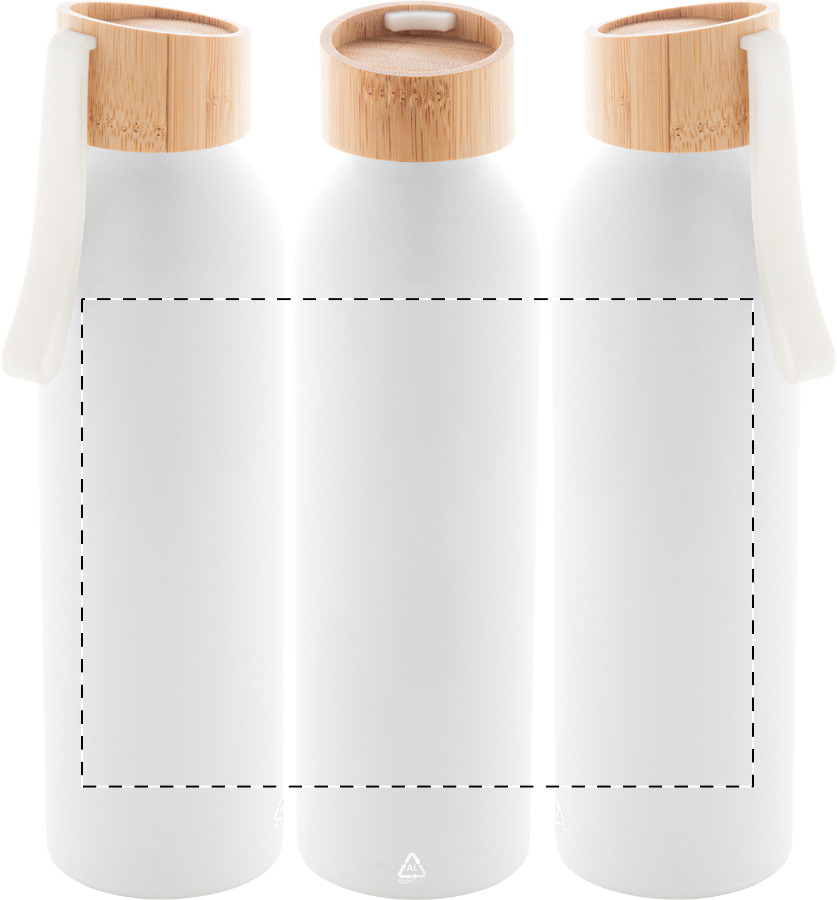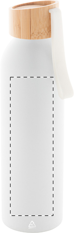 Flasche aus recyceltem Aluminium mit Bambus-Deckel und farblich abgestimmten Silikon-Trageschlaufe. Füllmenge: 600 ml.