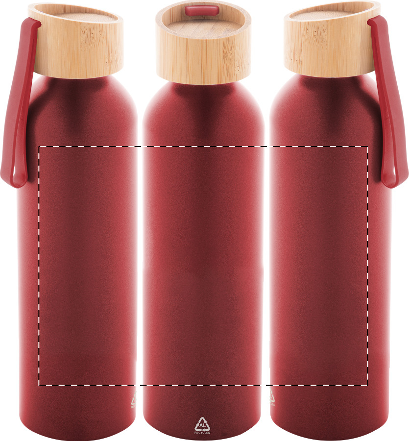 Flasche aus recyceltem Aluminium mit Bambus-Deckel und farblich abgestimmten Silikon-Trageschlaufe. Füllmenge: 600 ml.