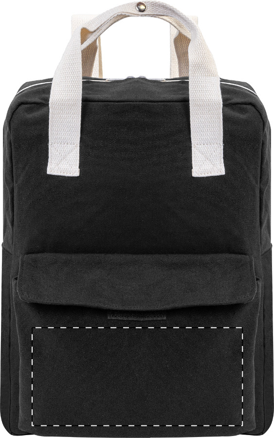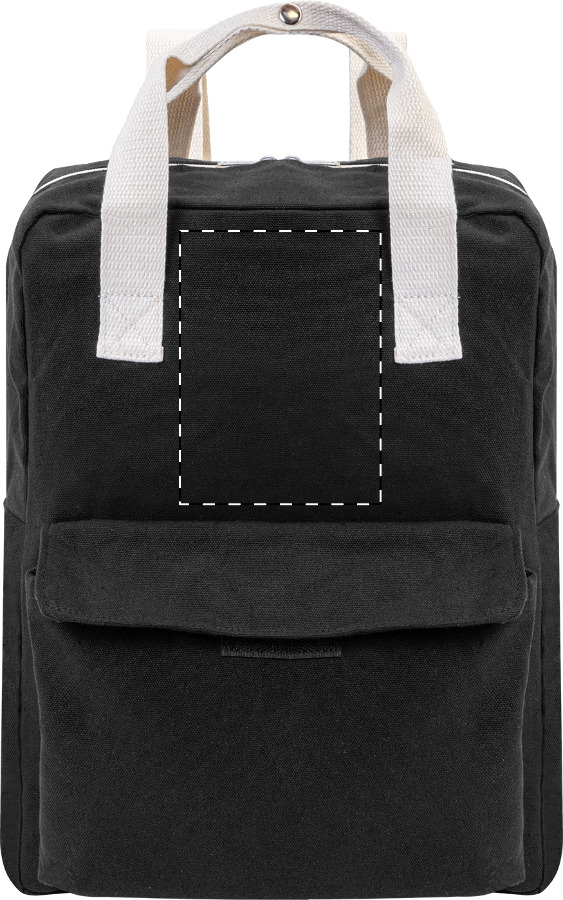 Rucksack aus recyceltem Canvas mit Reißverschluss-Haptfach, gepolstertem Laptopfach (13") und Fronttasche mit Klettverschluss. Material: 70% recycelte Baumwolle und 30% RPET Polyester. Mit Label RPET.