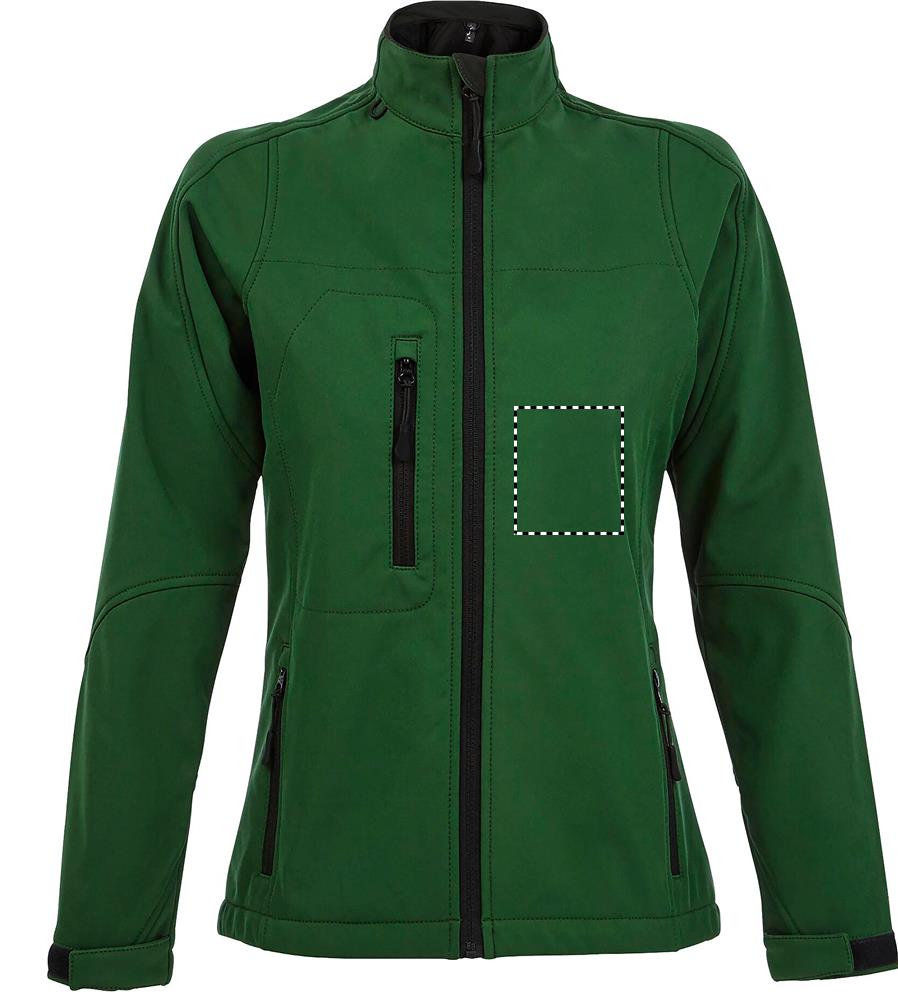 SOL'S ROXY Damen Softshell-Jacke aus technischem Gewebe. Wasserdicht und atmungsaktiv. Gut verarbeitete Ärmel und figurbetonender Schnitt für optimalen Komfort. 2 Seitentaschen mit Reißverschluss, 1 Brusttasche mit Reißverschluss, verstellbarer Kordelzug am Saum, Ärmelbündchen mit Klettverschluss, Microfleece-Futter, Tasche für Mobiltelefon. Material: SOFT SHELL 340g/m², 3lagig, 94% Polyester - 6