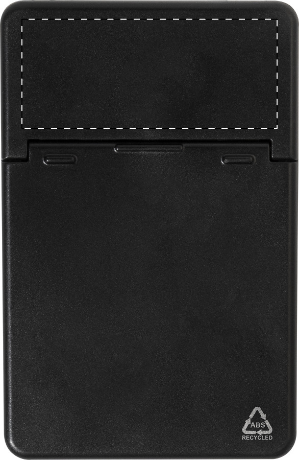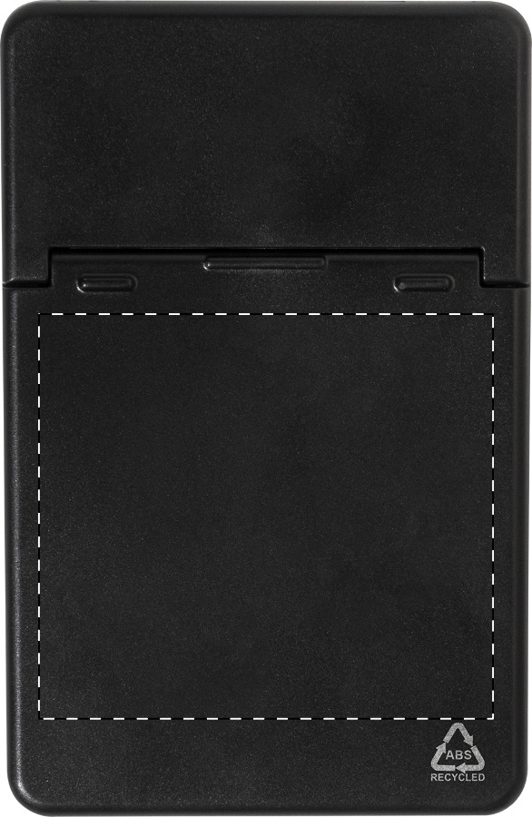 Kreditkartenetui aus recyceltem ABS mit RFID-Schutz, Handyhalterung und magnetischer Handybefestigung. Inklusive selbstklebendem Metallring für Handys ohne magnetische Oberfläche.