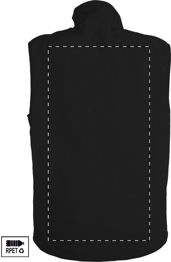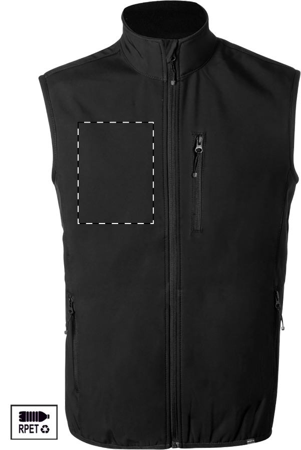 Atmungsaktive, wasser- und winddichte RPET-Softshellweste mit Reißverschluss, Brust- und Seitentaschen. Material außen: 92 % RPET-Polyester und 8 % Elastan. Material Innen: Mikrofleece aus 100 % RPET-Polyester (300 g/m²).