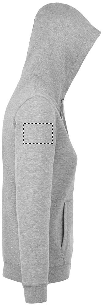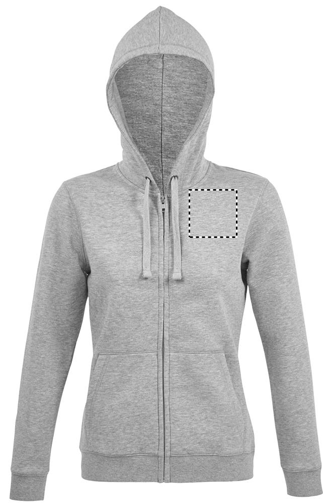 SOL'S SPIKE WOMEN. Damen Hoodie/Kapuzenjacke mit durchgehendem Reißverschluss. 80% ringgesponnene Baumwolle - 20% Polyester, angeraute Innenseite. Außen: 100% Baumwolle FLEECE 280 LSF (Low Shrinkage Fabric). Angesetzte Ärmel, 2 Känguru-Taschen auf der Vorderseite, geschnitten und genäht, Gefütterte Kapuze mit Ton-in-Ton-Kordelzug, Rippenbündchen am Saum und an den Ärmeln 2x2. Halbmondpasse auf der Krageninnenseite, Nackenband auf der Krageninnenseite, YKK-Reißverschluss. OEKO-TEX®. Verkauf nur mit Druck.