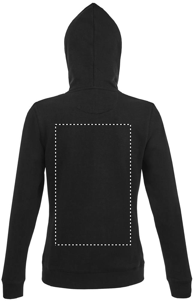 SOL'S SPIKE WOMEN. Damen Hoodie/Kapuzenjacke mit durchgehendem Reißverschluss. 80% ringgesponnene Baumwolle - 20% Polyester, angeraute Innenseite. Außen: 100% Baumwolle FLEECE 280 LSF (Low Shrinkage Fabric). Angesetzte Ärmel, 2 Känguru-Taschen auf der Vorderseite, geschnitten und genäht, Gefütterte Kapuze mit Ton-in-Ton-Kordelzug, Rippenbündchen am Saum und an den Ärmeln 2x2. Halbmondpasse auf der Krageninnenseite, Nackenband auf der Krageninnenseite, YKK-Reißverschluss. OEKO-TEX®. Verkauf nur mit Druck.