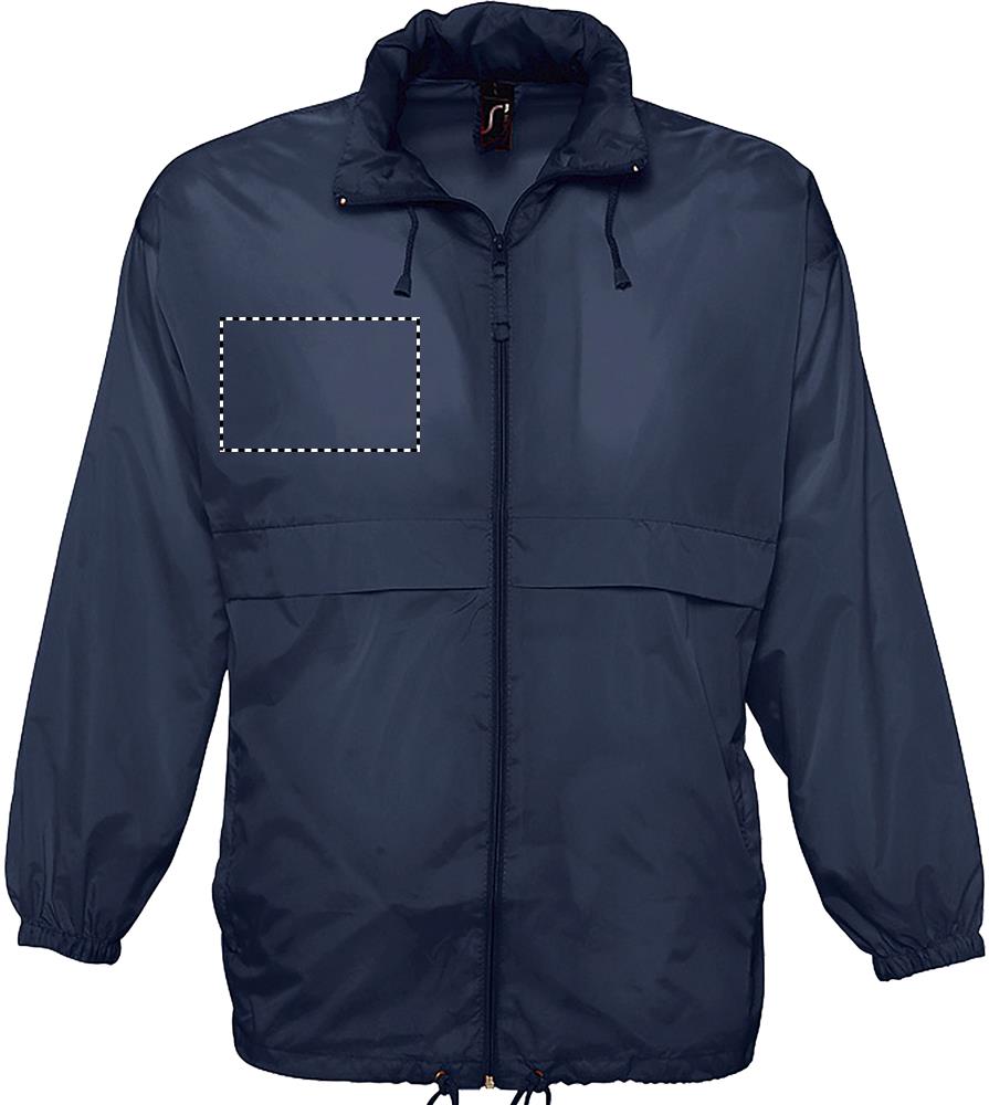SOL'S SURF, Unisex wasserabweisender Windbreaker, 100% Polyamid 210T, durchgehender Reißverschluss, Kapuze mit Kordelzug im Kragen gefaltet, 2 Außentaschen mit Reißverschluss, ''In Bag'' Faltsystem mit elastischen Taillengurten, elastische Ärmelbündchen, Belüftungsösen. Um Ihre passende Größe zu finden, beachten Sie bitte die Größentabelle unter Details/Size Chart.