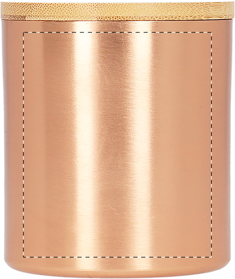 Vanille-Duftkerze in Behälter aus Aluminium mit Bambusdeckel.