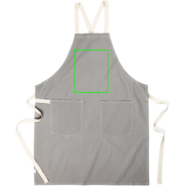 Schürze aus 70 % zertifizierter, recycelter Baumwolle aus Baumwollresten der Lieferanten. Fasern, die normalerweise als unbrauchbar gelten, haben mit dem entsprechenden Herstellungsverfahren die gewünschten Eigenschaften erreicht. Diese Schürze ist extra breit, um maximalen Schutz zu bieten. Zwei große Fronttaschen und eine Schlaufe zum Aufhängen von Utensilien oder einem Geschirrtuch.