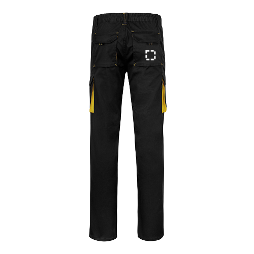Zweifarbige Stretch-Hose mit mehreren Taschen (240 g/m²), aus Baumwolle (46%), EME (38%) und Polyester (16%). Slim Fit, elastischer Bund und kontrastierende Farbe an den Zwickeln, Zugbändern und Nähten. Enthält sechs Taschen (2 französische Taschen, 2 seitliche Zwickeltaschen und 2 Gesäßzwickeltaschen). Größe: 34, 36, 38, 40, 42, 44, 46, 48, 50, 52, 54, 56, 58, 60