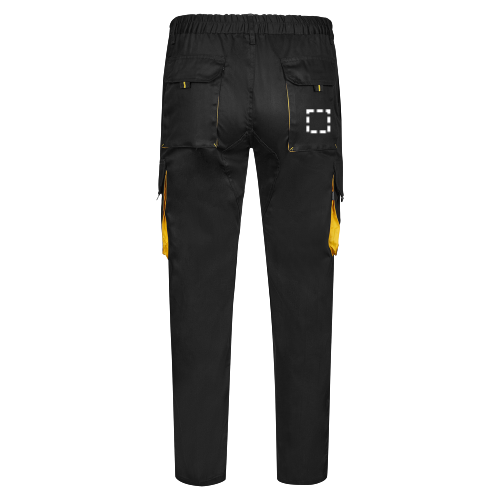 Zweifarbige Twill-Hose mit mehreren Taschen (200 g/m²), aus Baumwolle (35%) und Polyester (65%). Mit elastischem Bund und kontrastierenden Farben an den Zwickeln, Zugbändern und Nähten. Enthält sechs Taschen: (2 französische Taschen, 2 seitliche Zwickeltaschen und 2 Gesäßzwickeltaschen). Größe: 34, 36, 38, 40, 42, 44, 46, 48, 50, 52, 54, 56, 58, 60