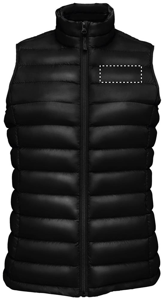 SOL'S WILSON BW WOMEN. Leichter Bodywarmer/Weste für Damen. Außenmaterial und Futter: 100% Polyamid. Wattierung: 60% Sorona, 40% recyceltes Polyester. POLYAMID 380T, Reißverschluss, 2 Fronttaschen mit Reißverschluss, 2 Innentaschen, niedriger Stehkragen, enganliegende Passform, ''In bag''-Faltsystem mit Stopper. OEKO-TEX®. Verkauf nur mit Druck.